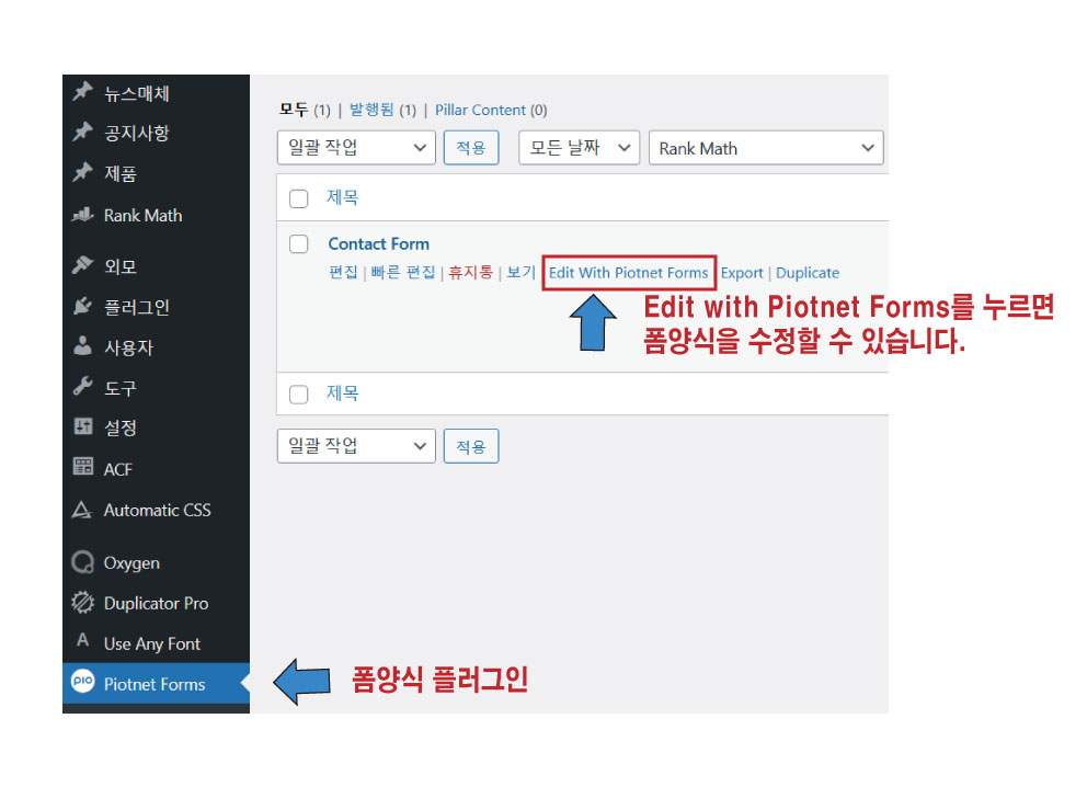 폼 내용을 수정하시려면, 관리자 대시보드 > Piotnet Forms > All Forms 에서 "Contact Form"의 내용을 수정하시면 됩니다.