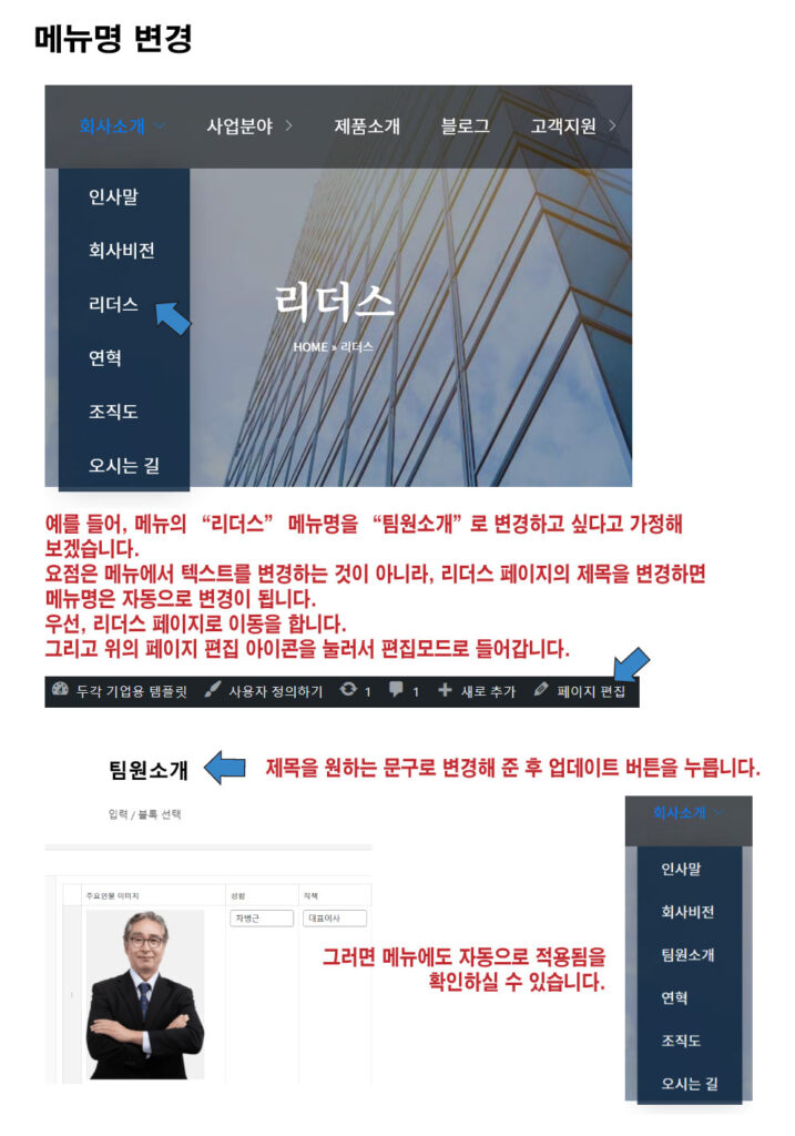 방법은 간단합니다. 리더스 페이지의 제목을 팀원소개로 변경해 주면 됩니다.